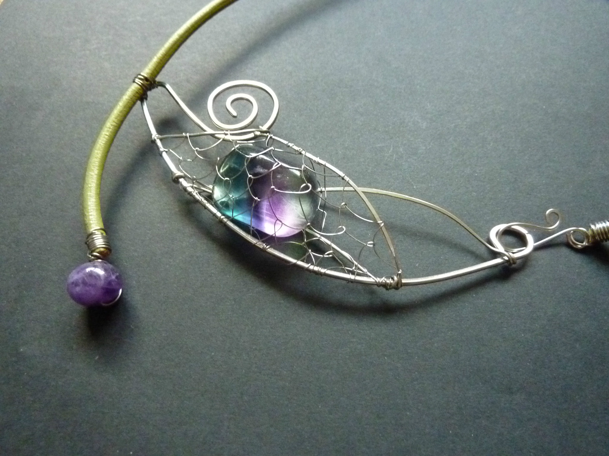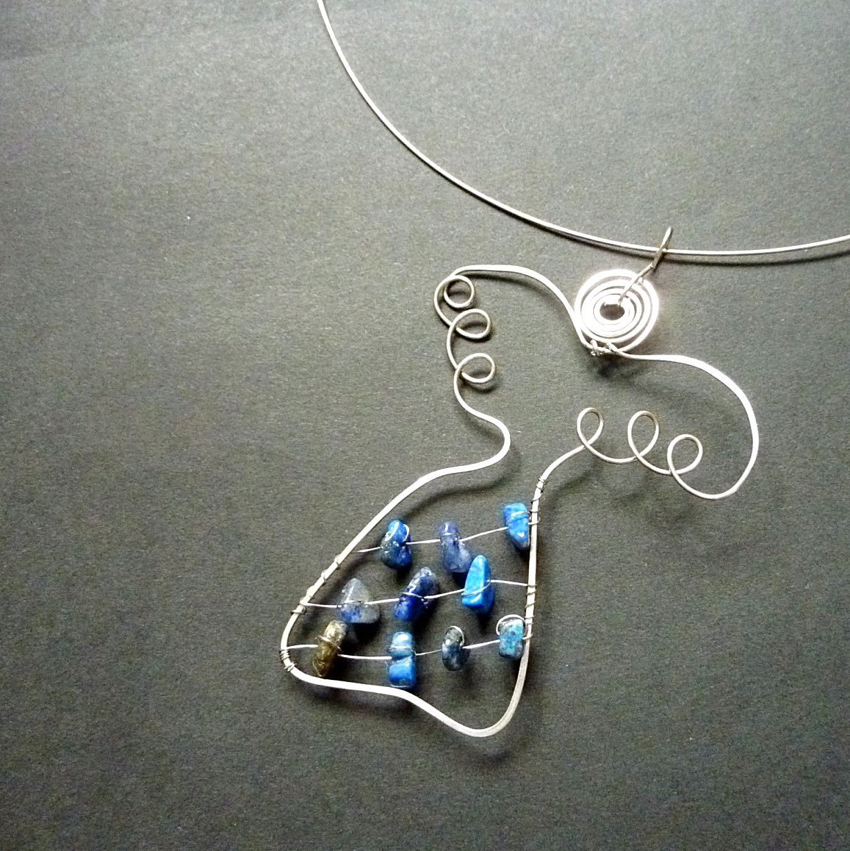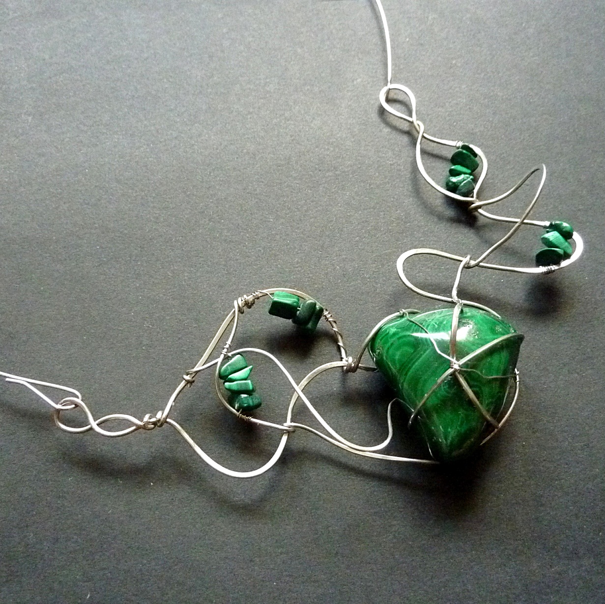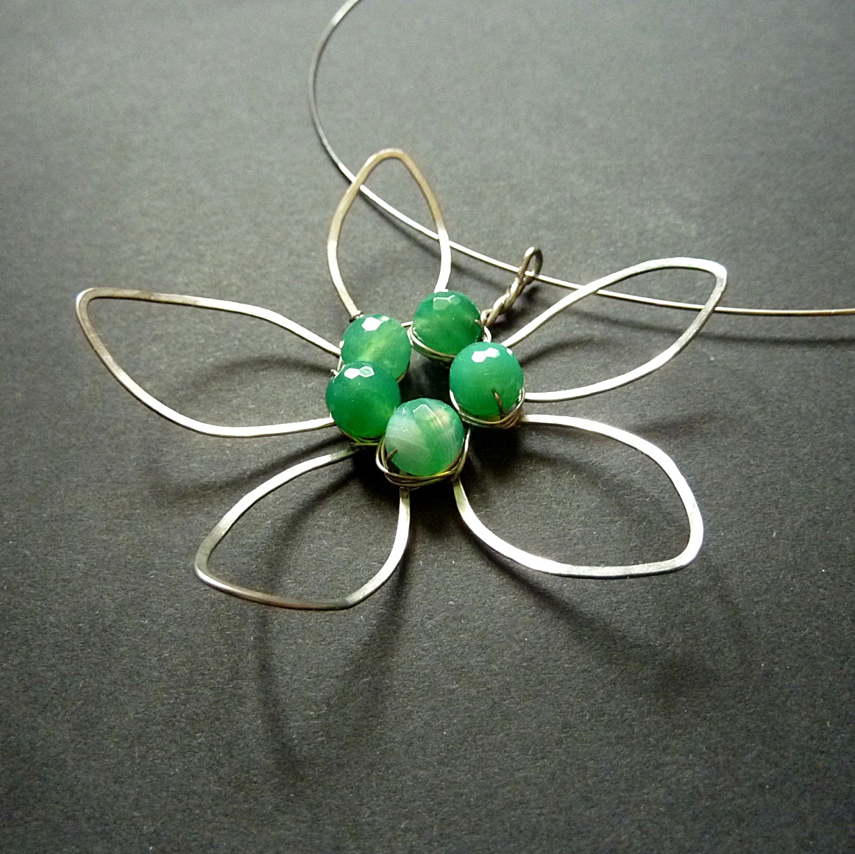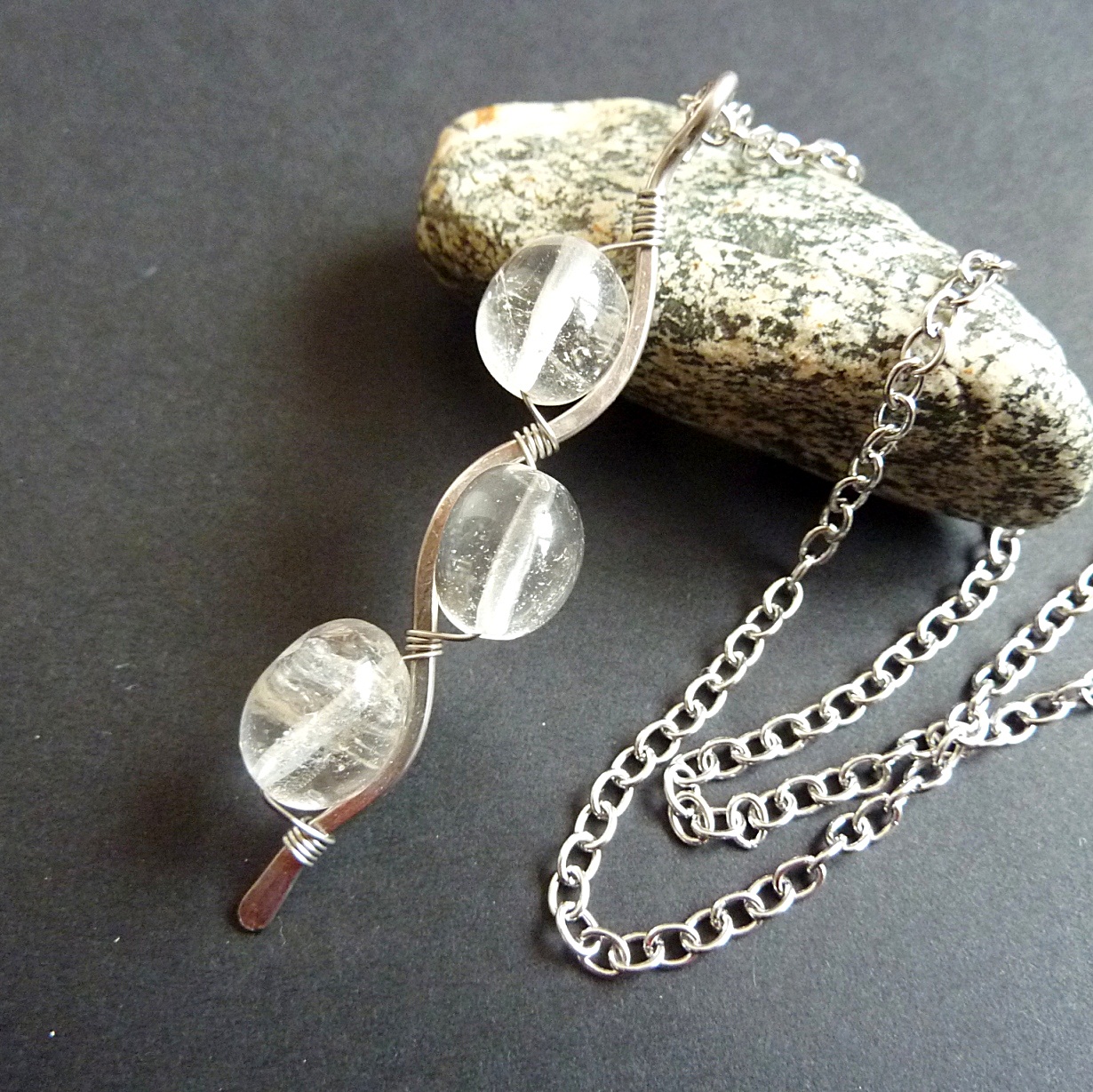 Naprosto mne pohltila krása a originalita chirurgické oceli, kterou kombinuji s přírodními minerály. Jejich spojením vznikla pod mýma rukama technika, která se jeví jako velmi vzdušná a prostorová. Minerály používám opracované, ale i surové.